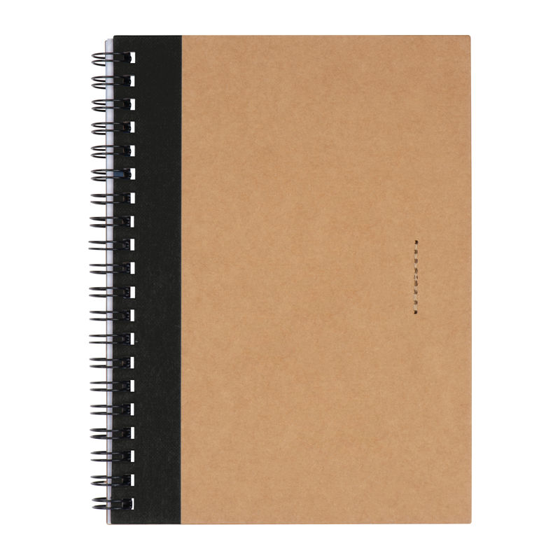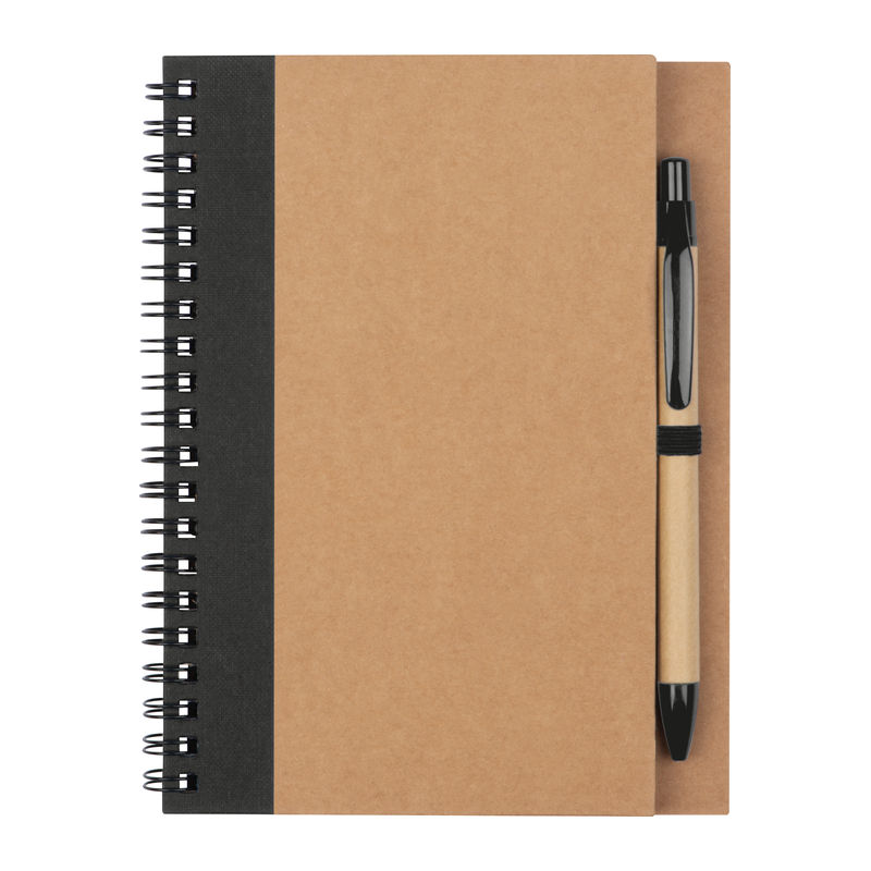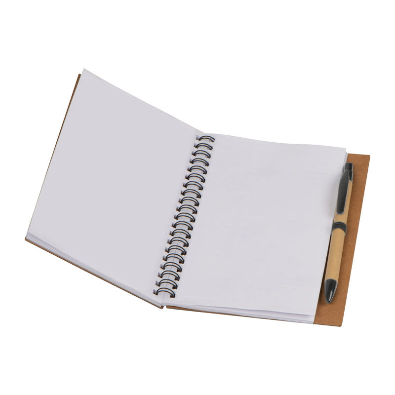Zápisník formátu A5 obsahujúci 120 čistých strán z recyklovaného papiera, doplnený modrým guľôčkovým perom vyrobeným z ABS a papiera.