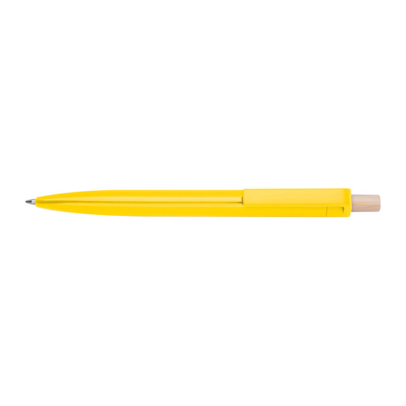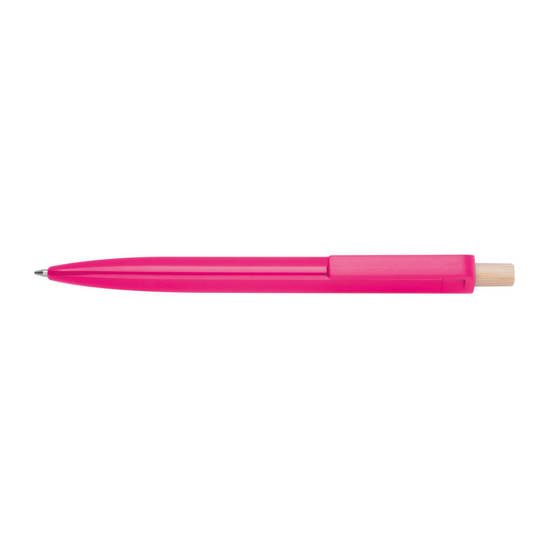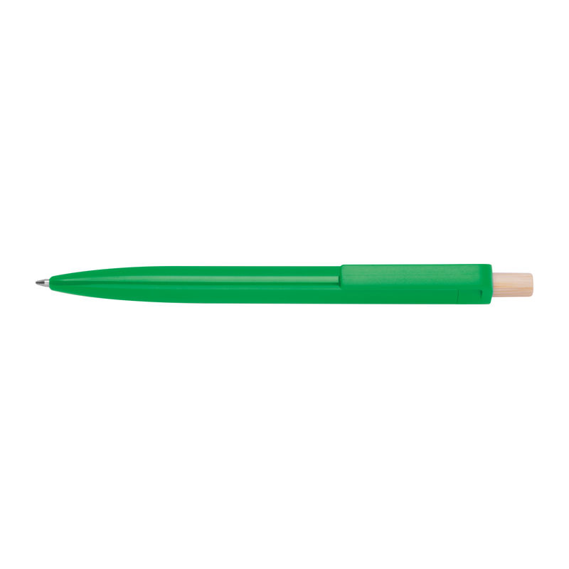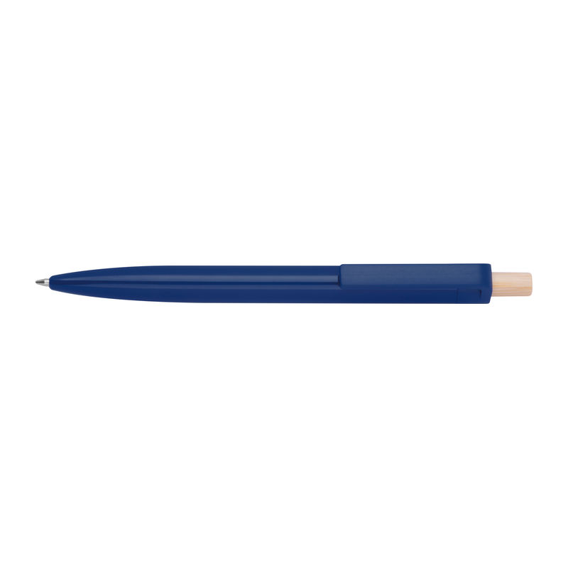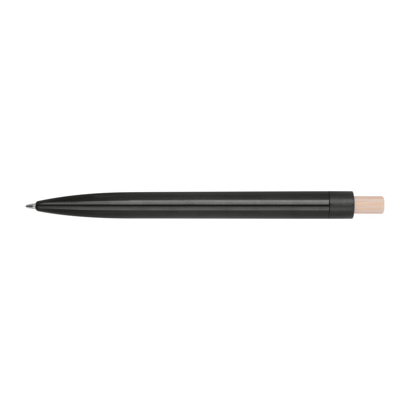 Guľôčkové pero vyrobené z recyklovaného ABS s tlačidlom z bambusu. Obsahuje modrú plastovú náplň.
